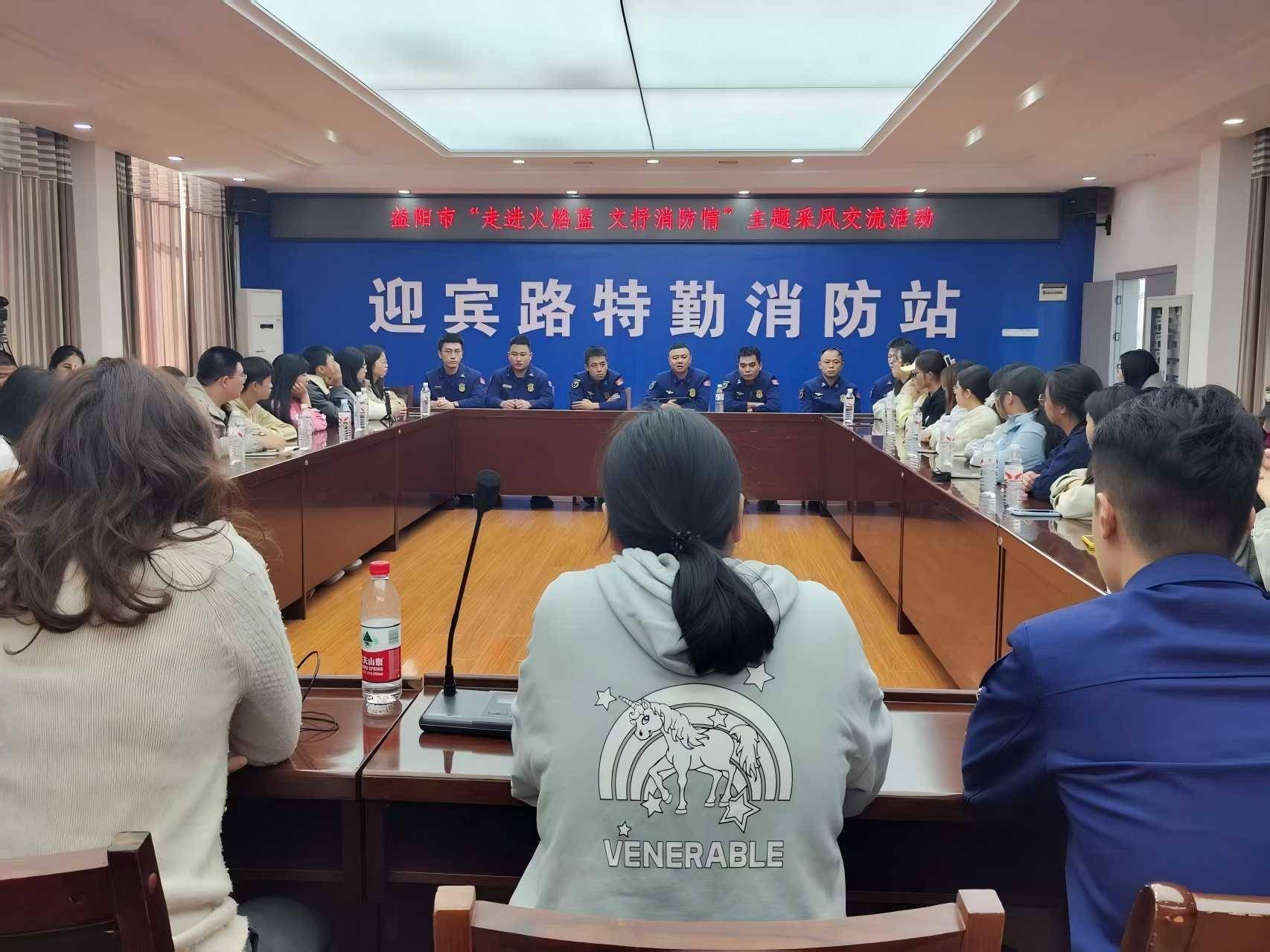 活动现场。罗惟摄人民网长沙10月27日电 近日,益阳市消防救援支队在迎宾路特勤站举办“走进火焰蓝 文抒消防情”高校学子采风活动。来自湖南城市学院、益阳师范高等专科学校等高校的40余名师生走进消防救援站进行参观和交流。