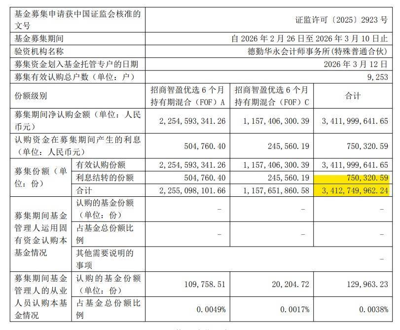3月13日,招商基金发布公告称,招商智盈优选6个月持有期(FOF)基金合同于2026年3月12日正式生效。该产品募集期为2026年2月26日至3月10日,净认购总额为34.12亿元,其中A类22.55亿元、C类11.57亿元;有效认购户数9253户。托管行为中国银行。